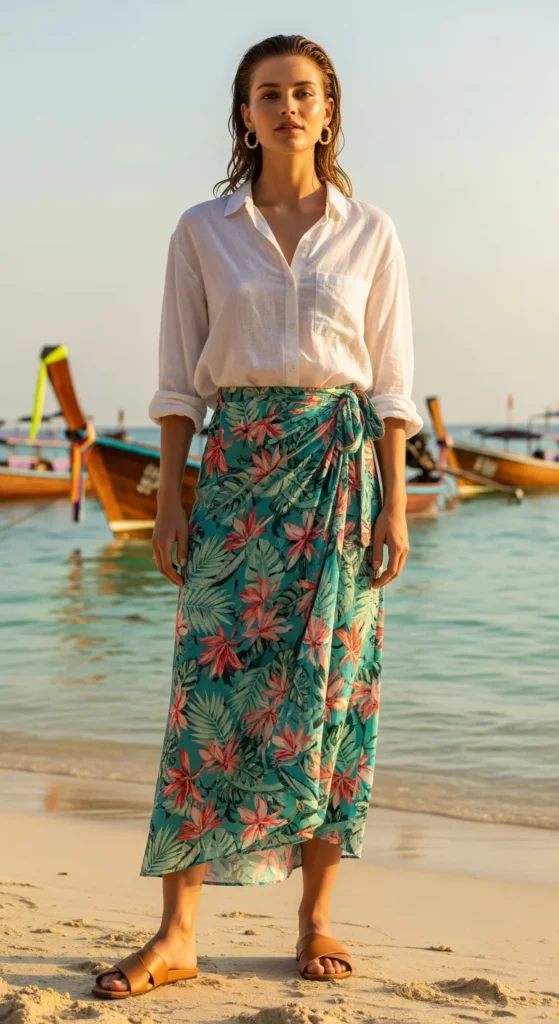 A slightly oversized white linen shirt tucked into a flowy tropical-print wrap skirt feels polished yet relaxed. The soft movement of the skirt against the ocean breeze makes it perfect for longtail boat rides and sunset walks.