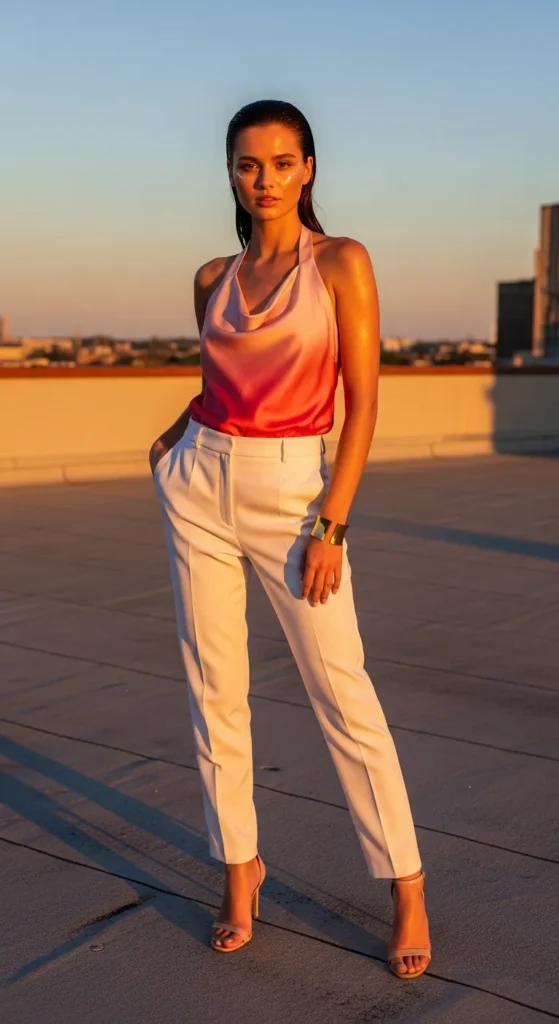 An ombre satin halter top blending soft sunset hues feels instantly celebratory. The gradient effect reflects light beautifully, making it ideal for evening birthday photos.