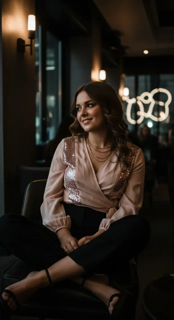 A wrap top with subtle sequined panel details adds movement and glow without overwhelming shine. It’s flattering and dynamic for birthday dinners or club nights.