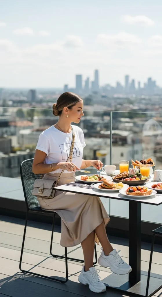 A chic graphic tee tucked into a satin midi skirt creates that perfect high-low balance. It feels expressive, confident, and effortlessly cool for a casual brunch hangout.