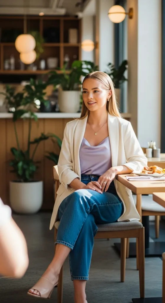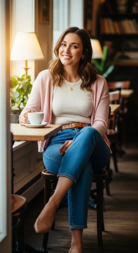 A fitted tank layered with a lightweight cardigan and classic jeans is perfect for cooler brunch mornings. It’s cozy yet chic without feeling heavy.