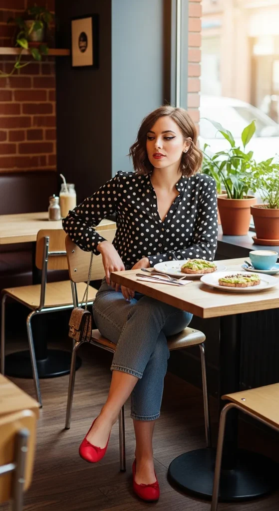 A soft polka dot blouse tucked into cropped straight jeans feels timeless yet fun. The print adds personality while keeping the outfit easy and approachable for casual brunch plans.