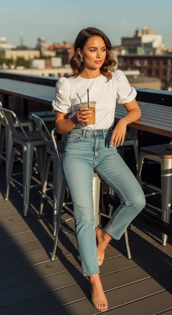 A lightweight white puff sleeve cotton blouse paired with high-rise straight-leg jeans creates that dreamy, feminine brunch energy. The volume on top balances structured denim, giving you a flattering silhouette that feels both fresh and confidently put together.