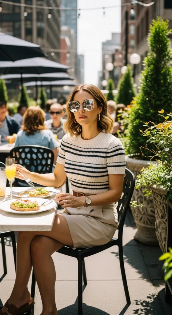 A lightweight striped knit top tucked into tailored high-waisted shorts feels fresh and slightly nautical. It’s a brunch outfit that’s relaxed yet thoughtfully styled.