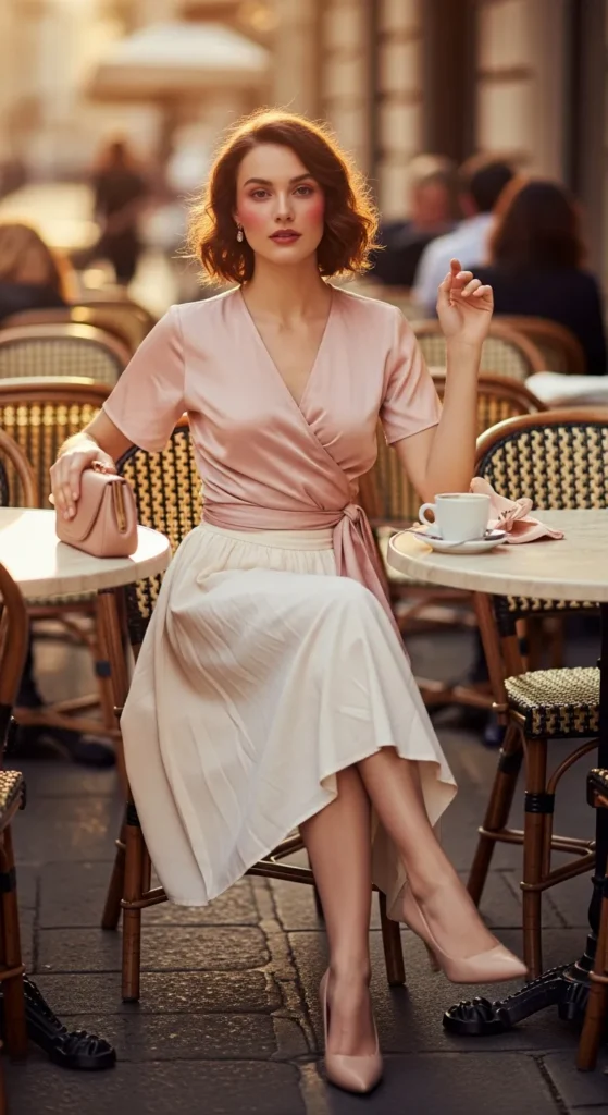 A wrap tie-front top paired with a flowy midi skirt creates movement with every step. This combination flatters the waist and feels flirty without trying too hard, ideal for a weekend brunch date.
