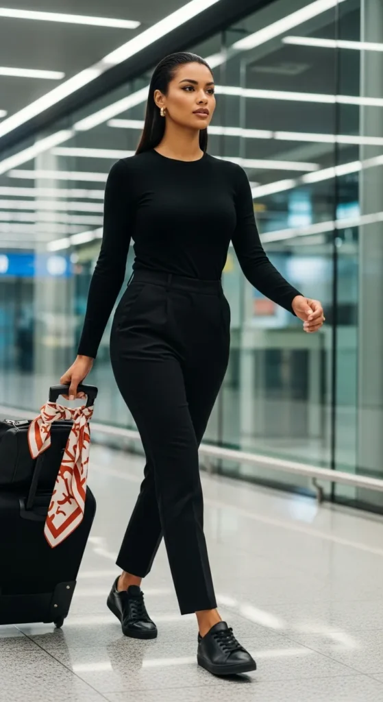 There is a reason so many women swear by all-black travel outfits. Black trousers, a fitted black long-sleeve top, and black sneakers form a uniform that hides travel fatigue, requires zero color coordination, and looks sharp in literally every airport, train station, and city street you walk through.