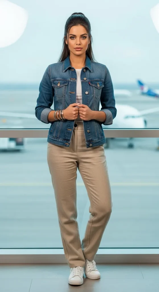 A mid-wash denim jacket is genuinely the most hardworking piece you can bring on a trip. It goes over sundresses on cool evenings, over a simple tee and trousers for daytime, and even over your pajama-style sets when you are rushing through an airport at 6 AM feeling like a disaster.