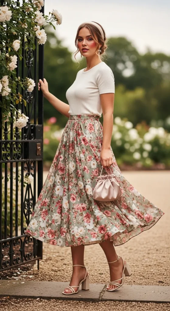 Stylist Suggestion: Match your footwear to the lightest color in the floral print rather than the darkest. This creates a visual flow from top to bottom and makes the outfit feel intentional rather than assembled. A simple headband or half-up hairstyle keeps the focus on the skirt, which is the real star of this look.