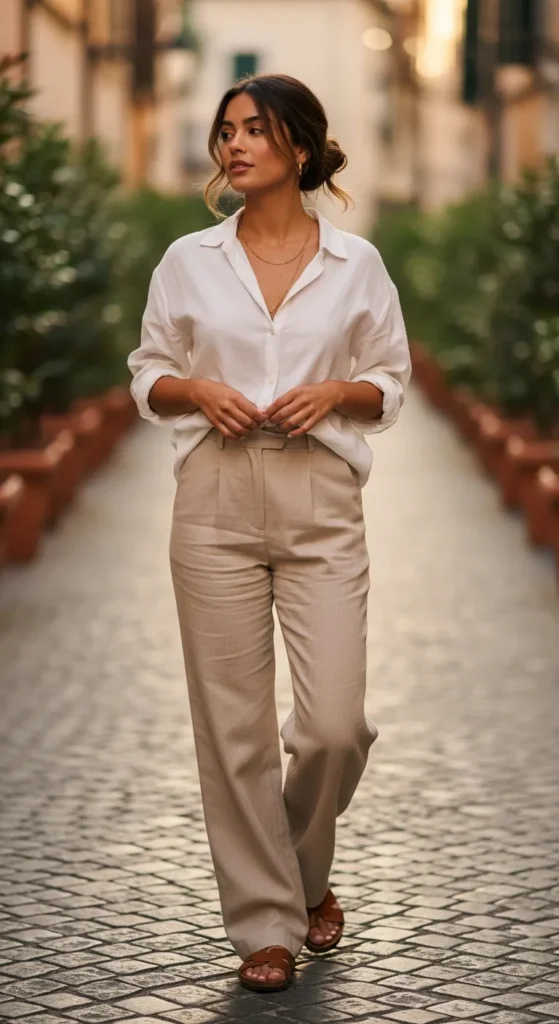 1. The Linen Shirt and Wide-Leg Trousers Combo