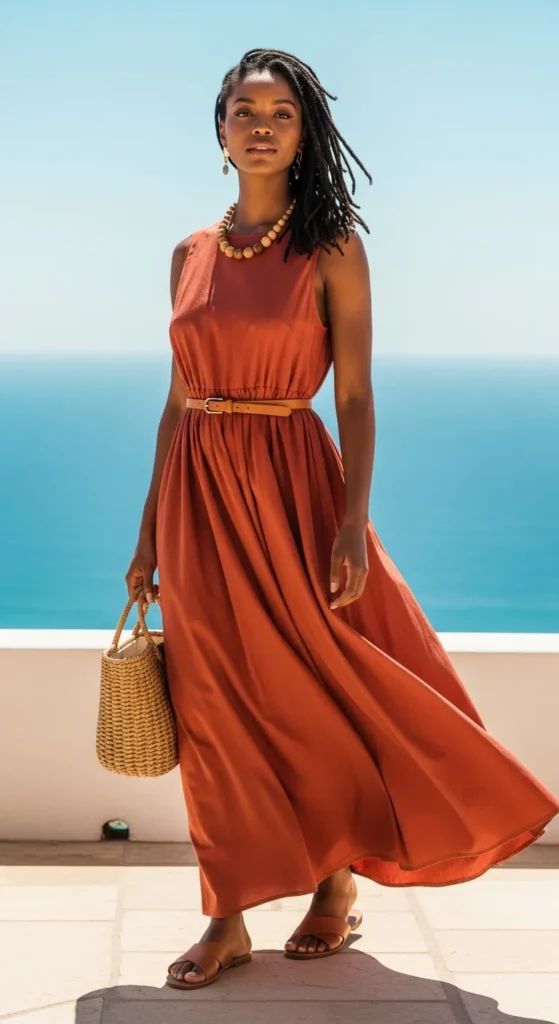 Stylist Suggestion: Wear a thin belt around your waist to give the maxi some shape, especially if it is a looser cut. The belt breaks the column of fabric and creates a waist, which makes a big visual difference in photos. Pair with simple leather sandals and a wooden or rattan bag for a warm-weather finish that feels intentional.