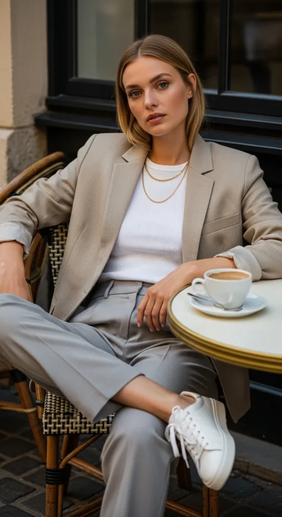 Throwing a well-cut blazer in a neutral like beige, grey, or white over a plain fitted tee and jeans is the move that makes every travel outfit look more expensive. It adds structure, covers up if a venue is more formal than expected, and acts as a light layer on cooler evenings.