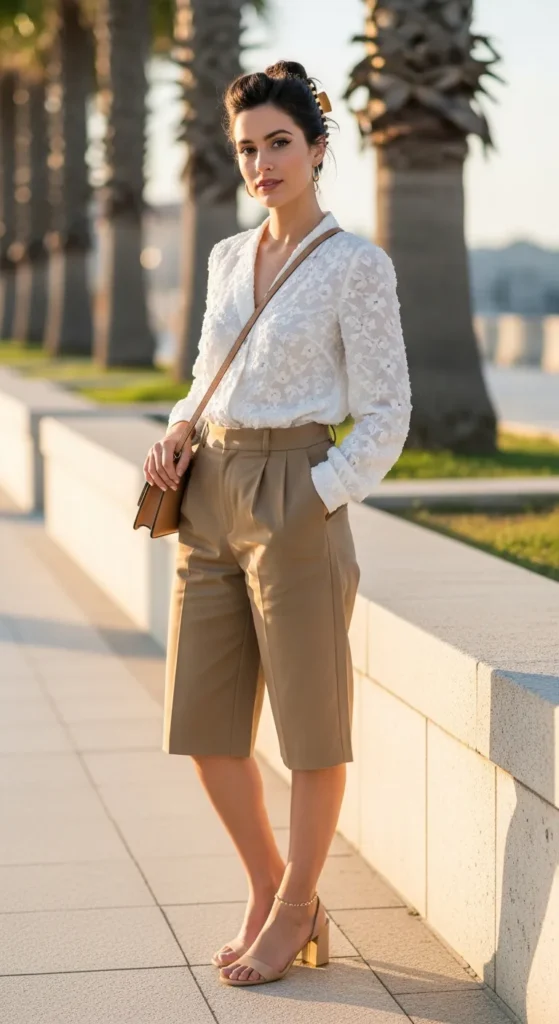 A pair of tailored shorts in a solid color, not athletic shorts, paired with a tucked-in blouse creates a put-together warm-weather look that does not read as overly casual. Khaki, olive, or white shorts with a floral or textured blouse hit a sweet spot between beach-ready and city-appropriate.
