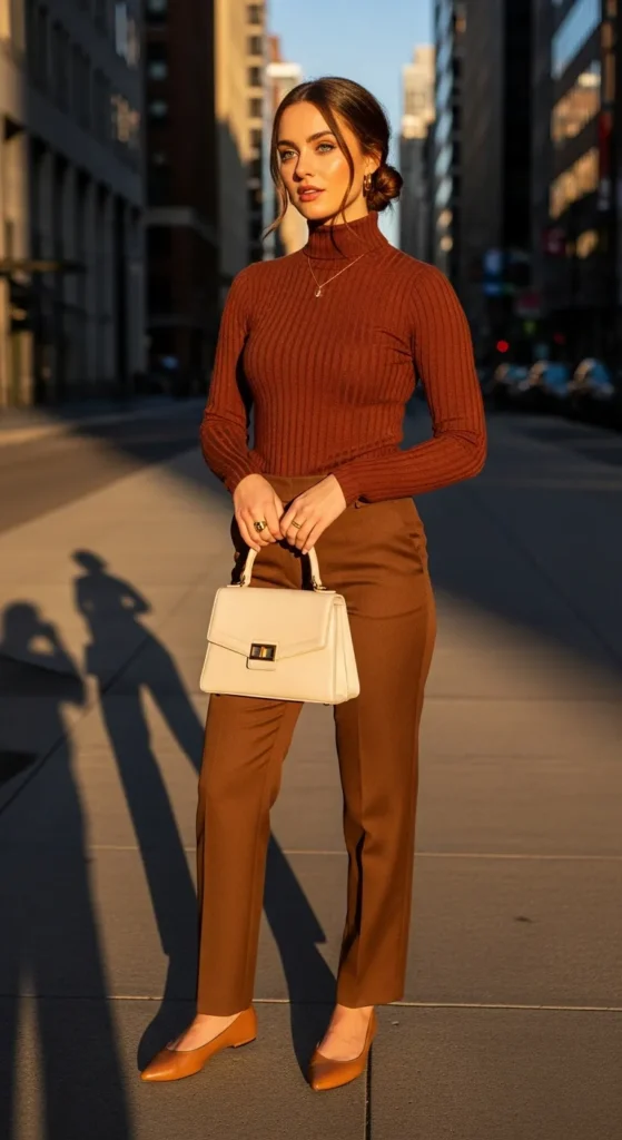 For cooler destinations or shoulder-season travel, a fitted turtleneck in a warm tone like rust, chocolate, or oatmeal tucked into straight trousers is a quietly chic combination that photographs beautifully in urban settings. It is practical, warm, and looks genuinely stylish without any effort.