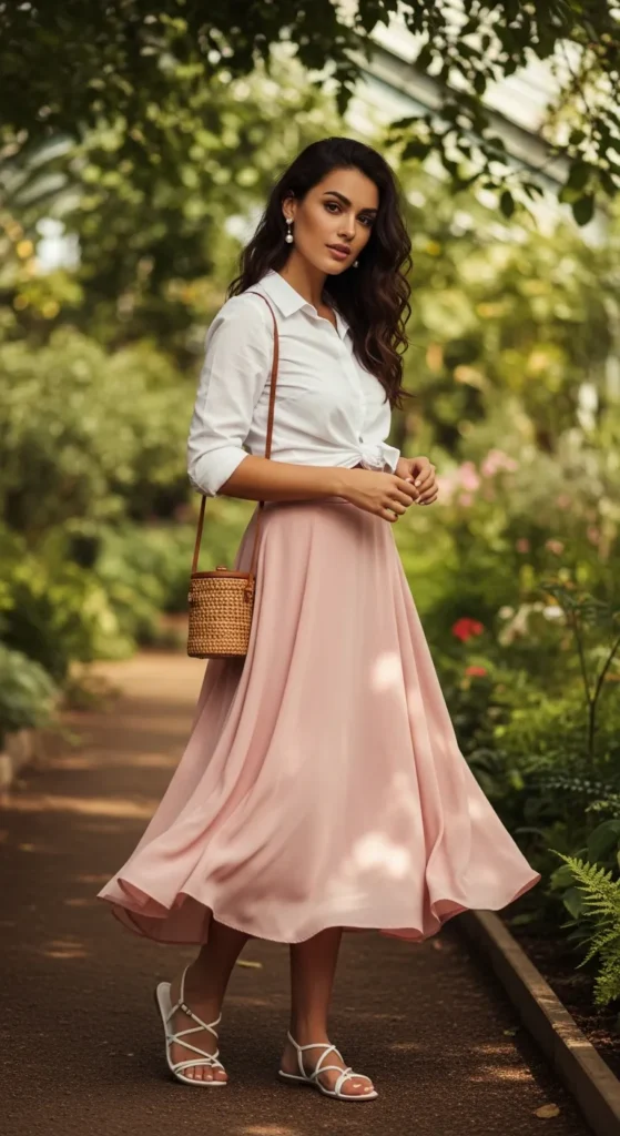 A crisp white button-down half tucked into a flowy midi skirt is endlessly versatile. Wear it on a ferry crossing, in a botanical garden, or at a seaside café. The skirt adds movement, the shirt grounds it, and together they read both relaxed and refined without any effort.