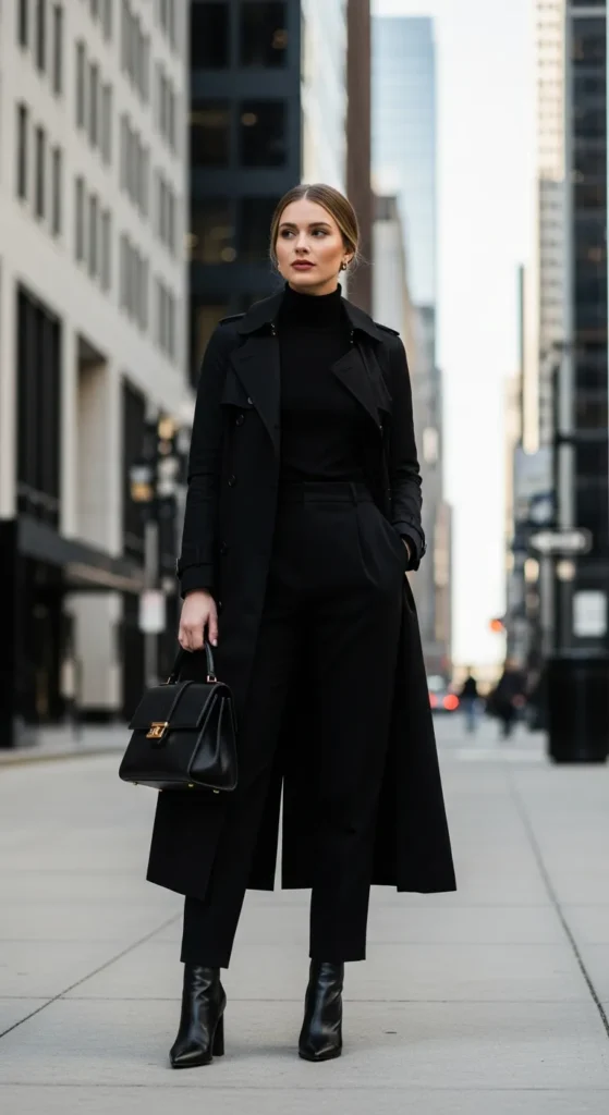 A classic black trench paired with a fitted black turtleneck and tailored trousers feels sleek and intentional, offering a confident winter outfit that works for busy days when you want to look sharp without extra effort.