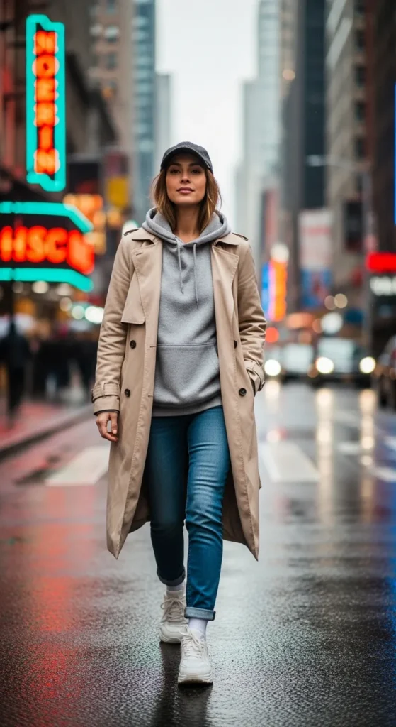 Stylist Suggestion: Finish with chunky sneakers and a baseball cap. The sporty elements balance the tailored trench, making the outfit feel intentional rather than mismatched.