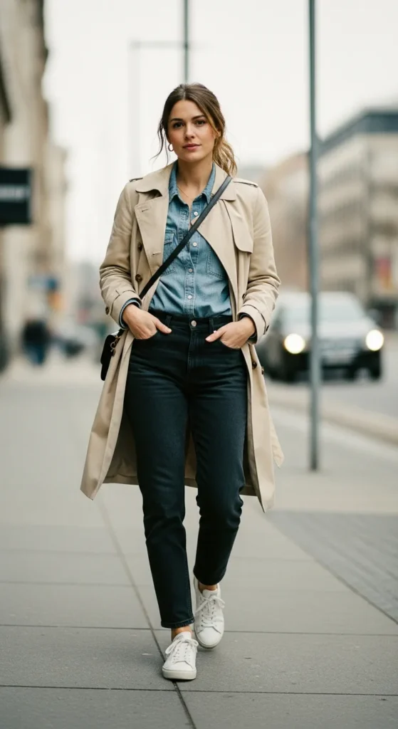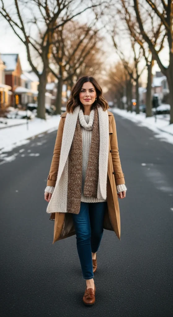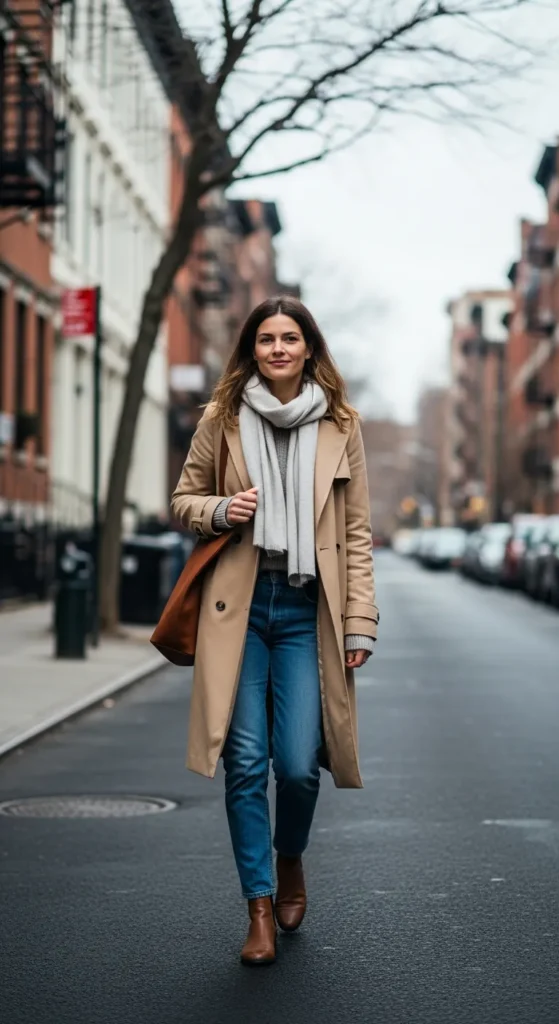 A neutral trench styled with a chunky scarf, relaxed sweater, and slim jeans feels warm and approachable, making it perfect for chilly afternoons when comfort matters just as much as style.