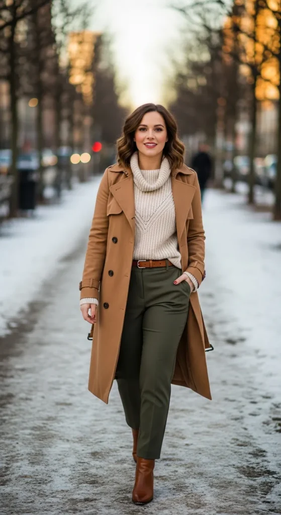 A tailored trench over a soft blouse and ankle-length trousers feels professional yet modern, making it a smart winter outfit for workdays when you want to look polished without feeling overdressed.