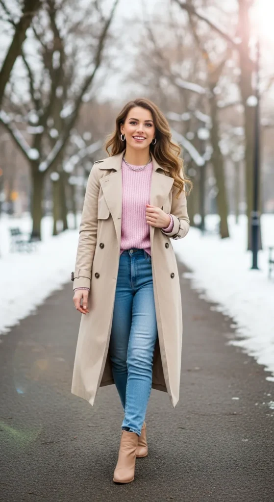 A neutral trench layered over soft pastel knits creates a gentle winter outfit that feels fresh and light, offering contrast against darker winter surroundings without feeling too bold.