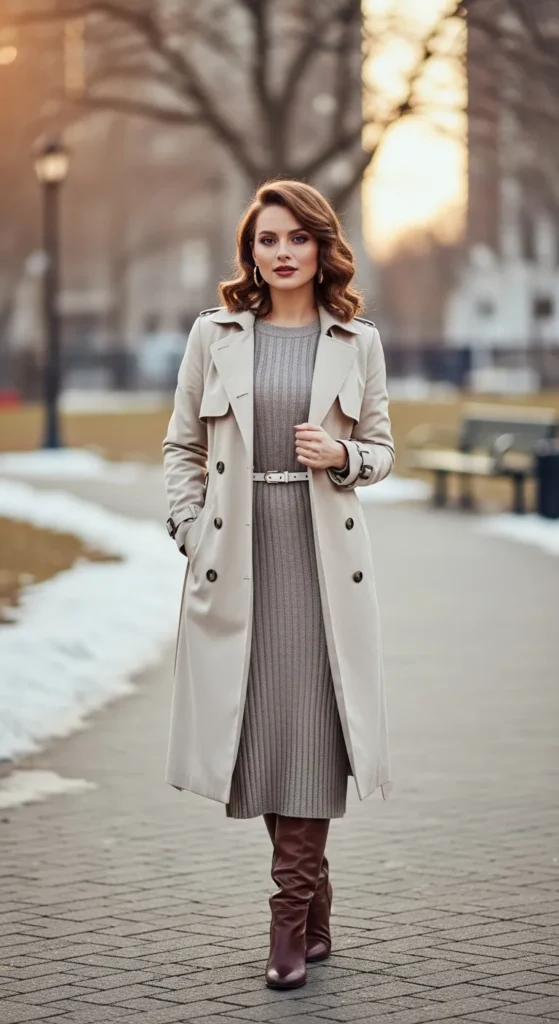 A midi knit dress under a structured trench creates an elegant yet wearable winter outfit that moves easily from daytime plans to evening moments, offering warmth without sacrificing femininity or comfort.
