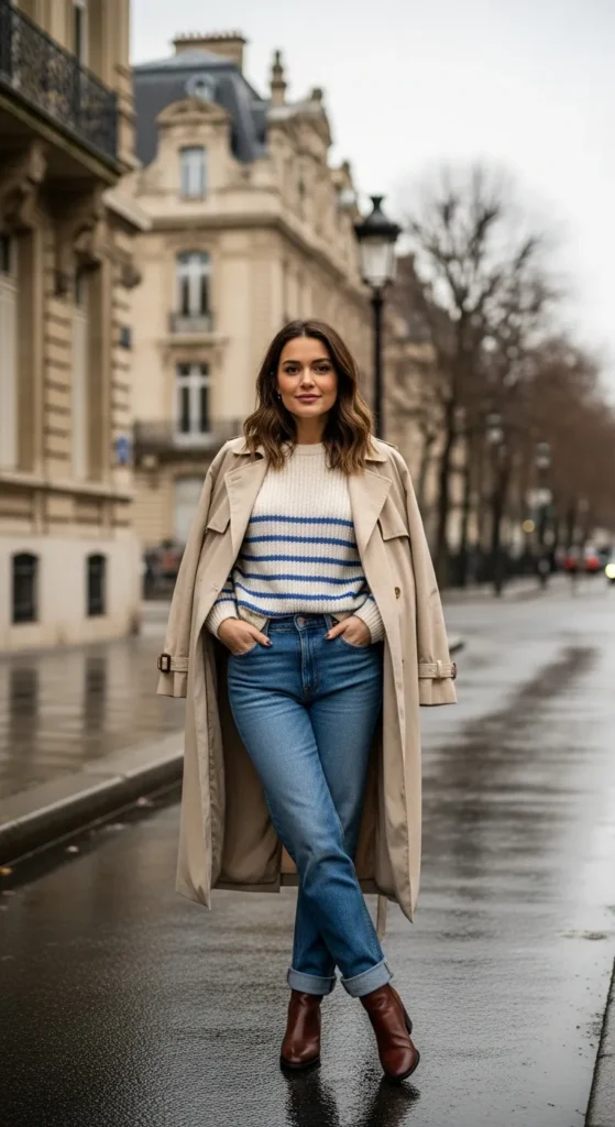 A striped knit under a trench adds a timeless touch to your winter outfit, offering visual interest while staying familiar and wearable for everyday city life.
