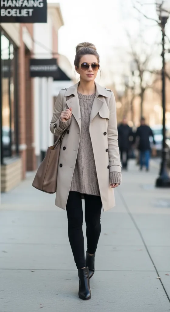 A trench paired with a relaxed sweater, leggings, and ankle boots creates a comfortable winter outfit that still looks intentional, ideal for busy weekends when ease is essential.