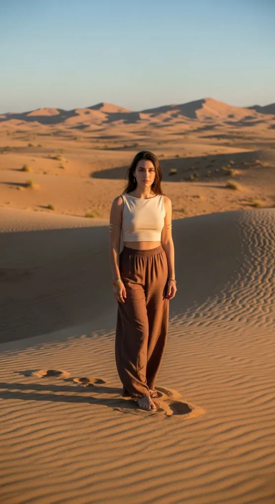 Earth-toned bohemian palazzo pants paired with a lightweight cream crop top. Breathable and comfortable while exuding desert elegance.