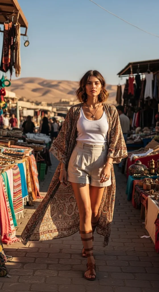 Printed boho kimono layered over basic tank tops and linen shorts. Playful, stylish, and sun-smart.