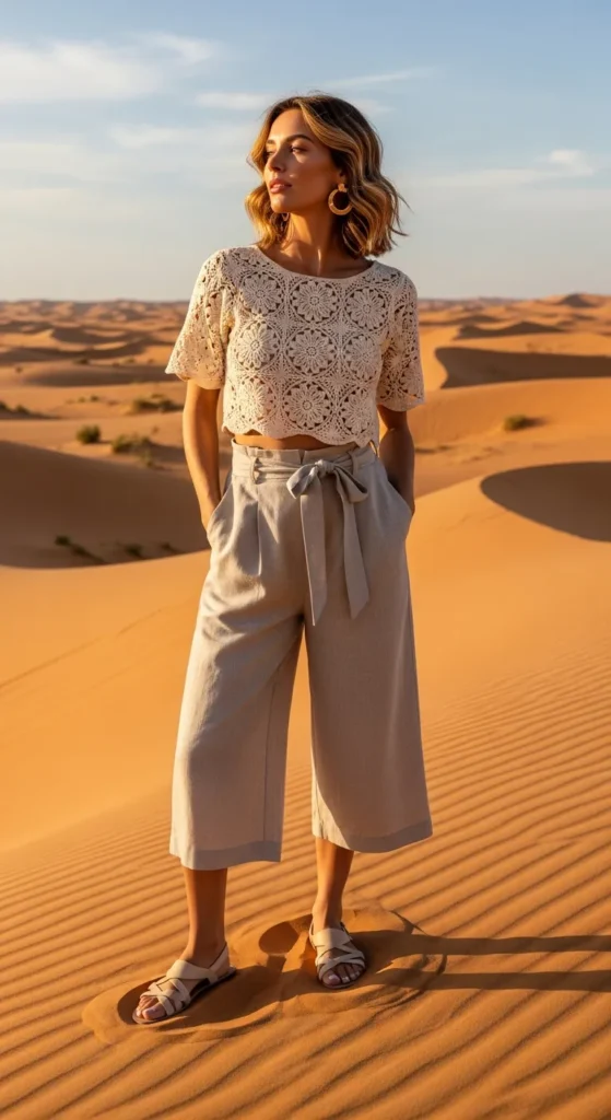 Delicate crochet top paired with wide-leg linen culottes. Lightweight and airy, perfect for a warm, stylish day.