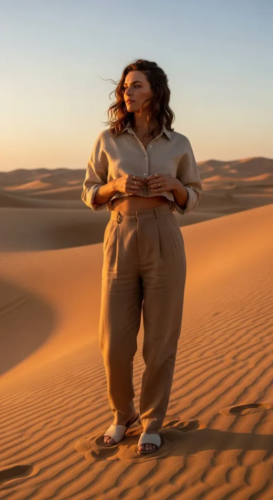 Stylist Suggestion: Cinch the waist with a thin leather belt and roll up sleeves for a chic yet practical look. Hair in a loose bun for a polished desert-ready style.