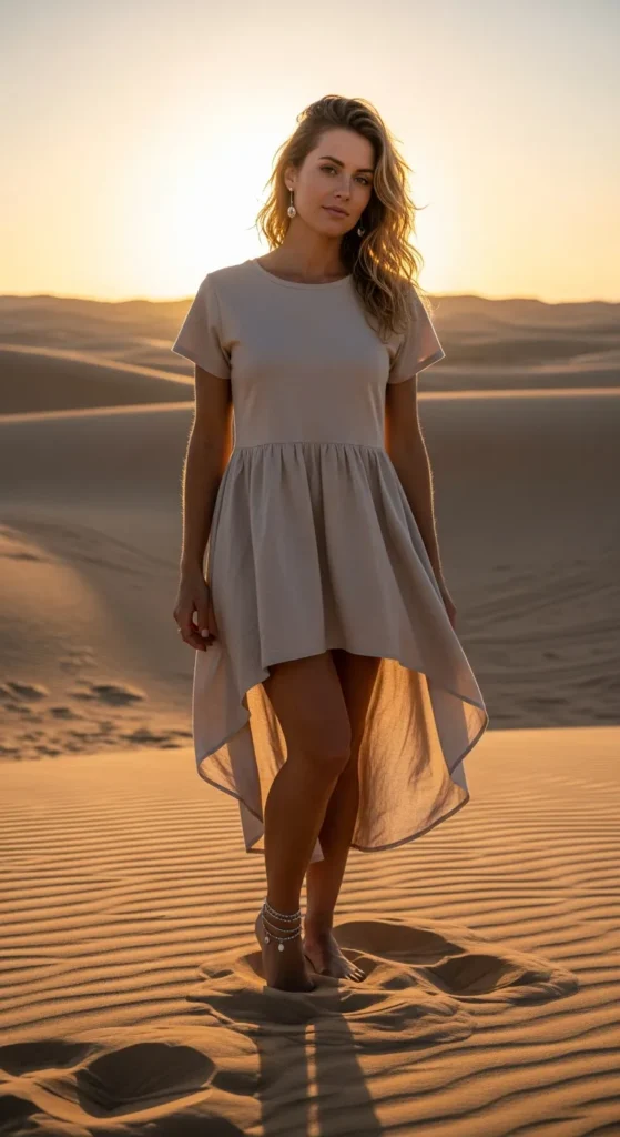 Soft cotton dress with high-low hem, airy and perfect for desert breezes. Neutral tones complement the golden sand.