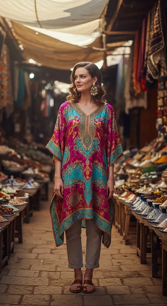 Vibrant colored kaftan-style tunic over neutral linen pants. Cultural nod while keeping cool and stylish.