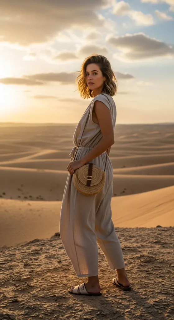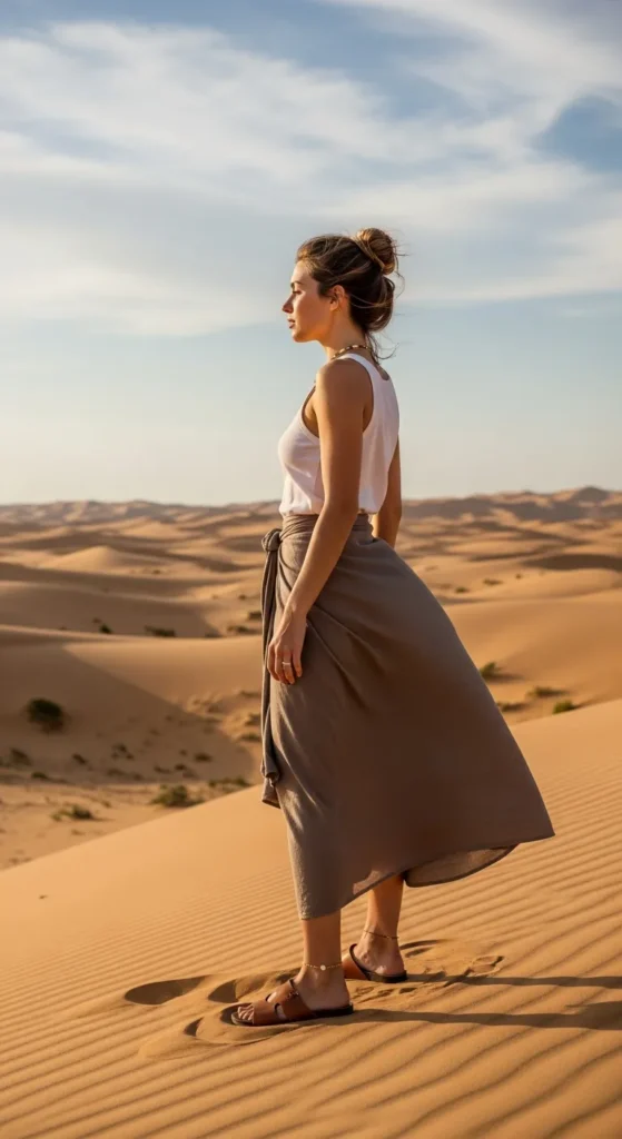 Stylist Suggestion: Pair with nude espadrilles and layered bracelets. Hair in loose braids for a practical yet stylish desert-ready look.