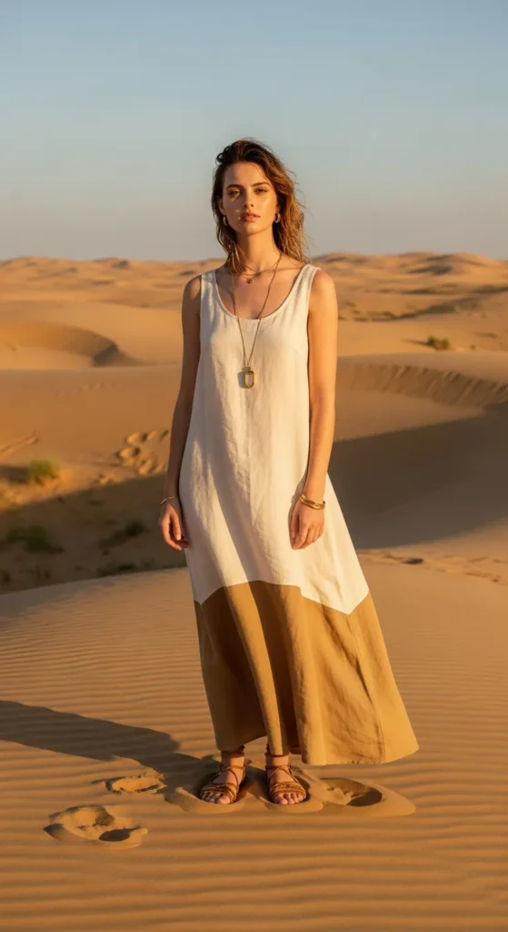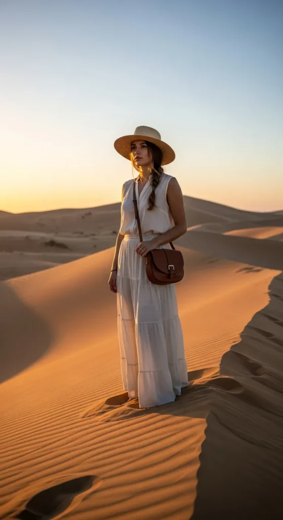 Stylist Suggestion: Add a wide-brim hat and nude strappy heels for a balanced, fashionable desert silhouette.