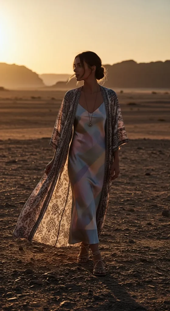 Soft pastel silk slip dress layered with a patterned kimono. Balances elegance and coverage for desert breezes.