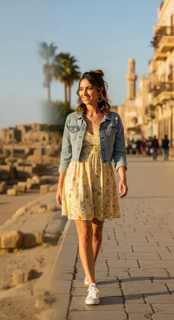 Pastel sundress paired with a cropped denim jacket. Ideal for early mornings and cooler desert evenings.