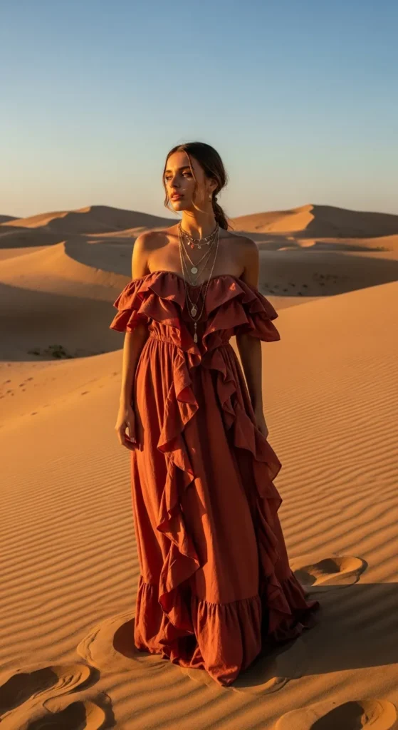 Terracotta-colored off-shoulder maxi dress with subtle ruffles. Lightweight cotton keeps it airy while complementing desert tones beautifully.