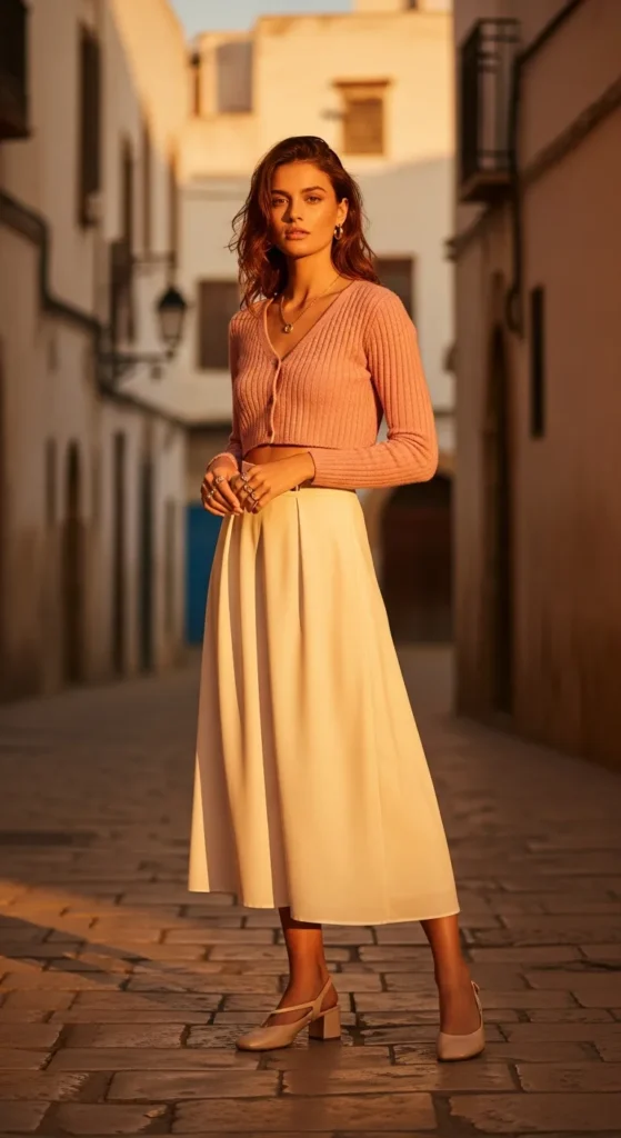 A lightweight cropped cardigan layered over a midi skirt feels feminine and practical for spring evenings when temperatures dip slightly.