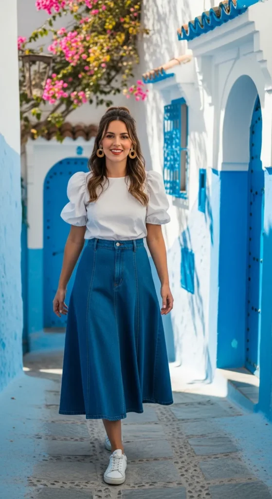 A structured denim midi skirt paired with a light puff-sleeve blouse balances casual and romantic energy. It’s ideal for long walking days while still looking styled.