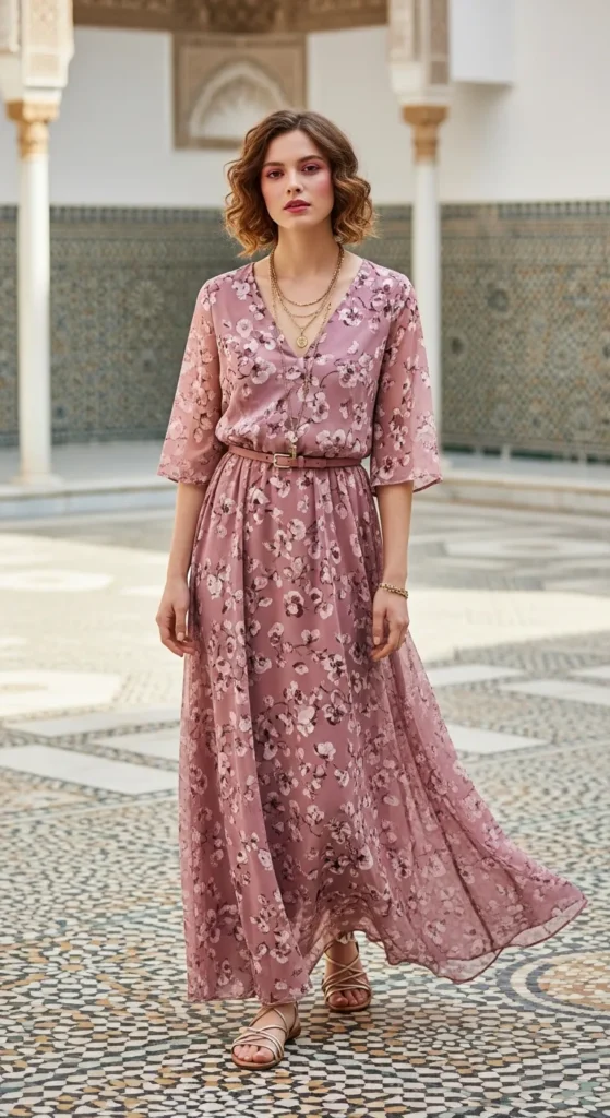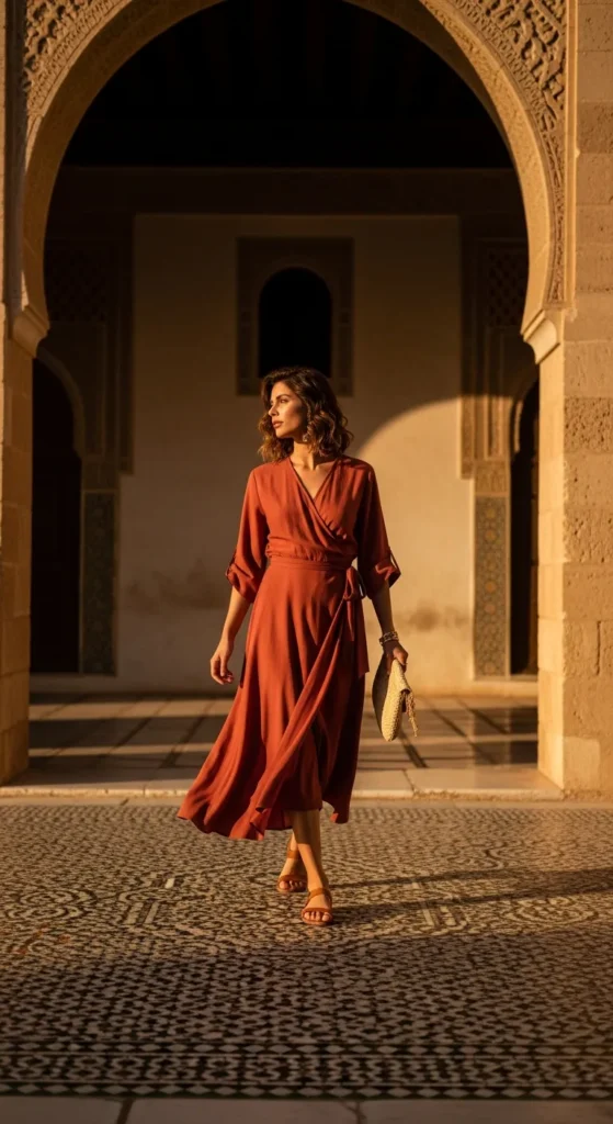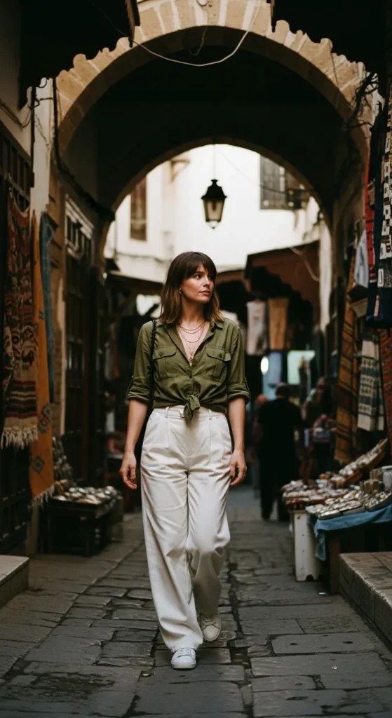 A soft maxi dress in a delicate print feels romantic without being overpowering. It moves gracefully while exploring mosaic courtyards and keeps you cool under the North African sun.