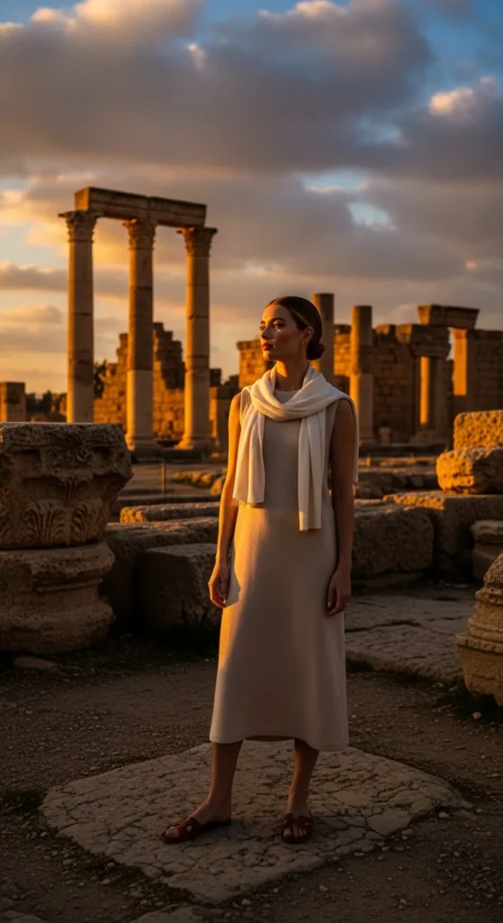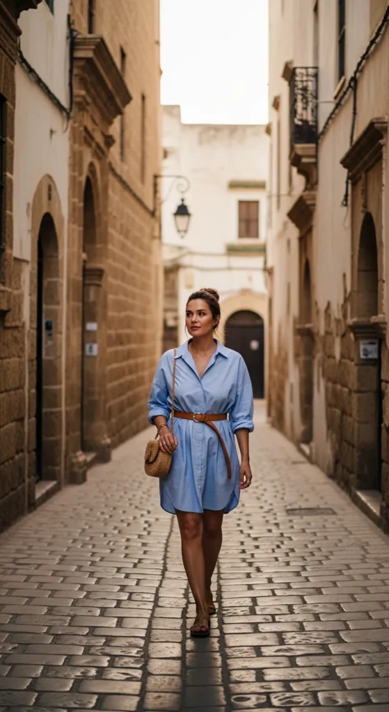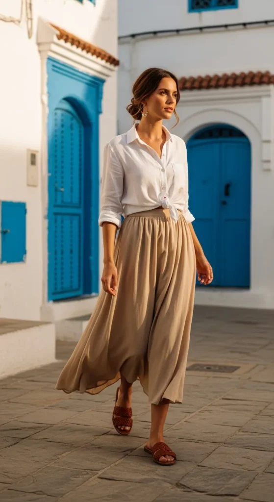 A crisp linen button-down tucked into a soft, flowing midi skirt feels perfectly Mediterranean. It’s airy enough for warm Tunis afternoons yet refined for exploring courtyards and seaside cafés without ever feeling overdressed.