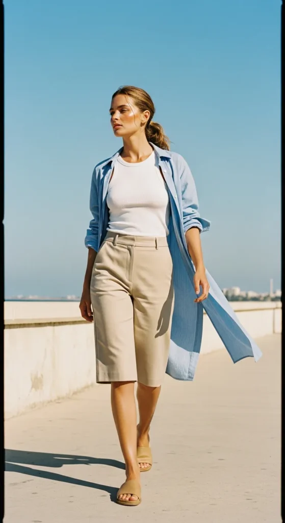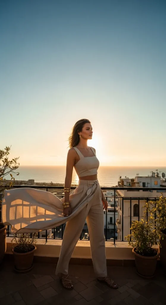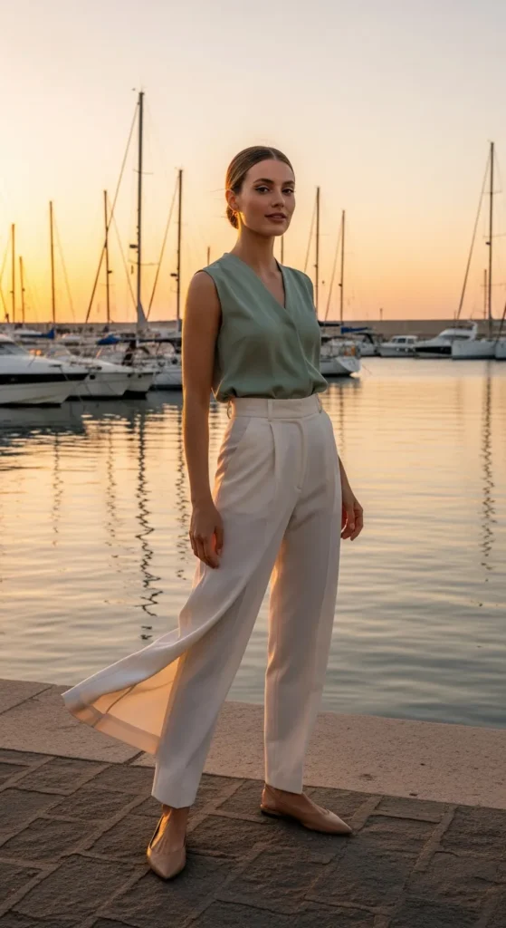 High-waisted wide-leg trousers paired with a sleeveless blouse create a sophisticated silhouette that flows beautifully in warm breezes. It’s refined but breathable, perfect for museum visits or sunset dinners near the marina.