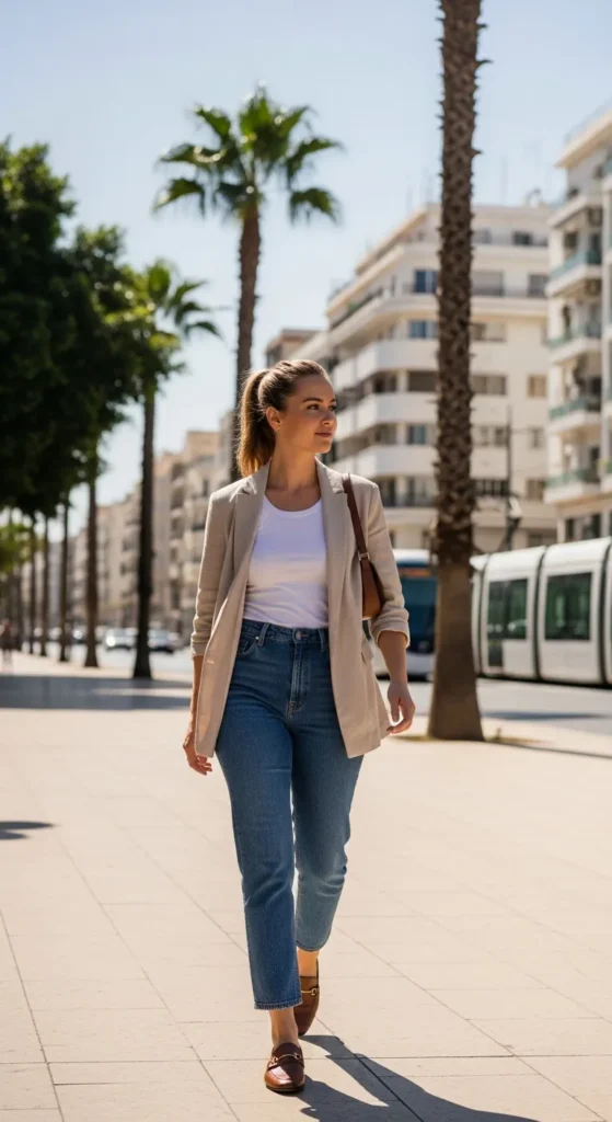 A breathable blazer layered over a fitted tank and straight-leg jeans feels urban and polished. Perfect for city cafés and cultural galleries.