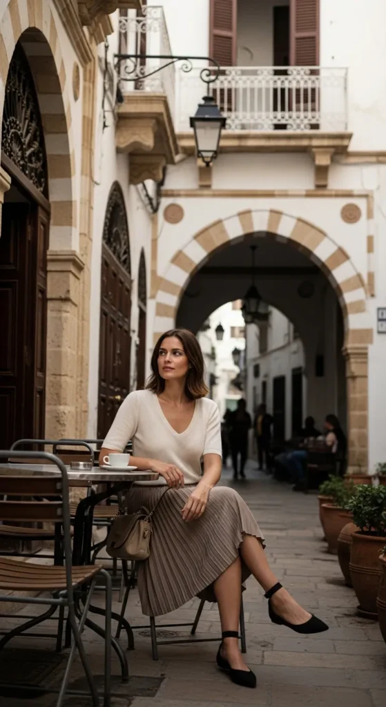 A lightweight knit top tucked into a pleated midi skirt gives effortless elegance. It’s perfect for café hopping or photographing architecture without sacrificing comfort.