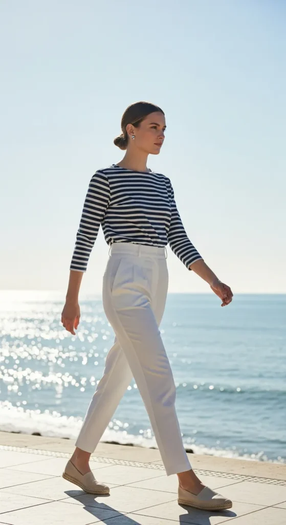 A striped Breton-style top with crisp white trousers nods subtly to Mediterranean coastal charm without being cliché.