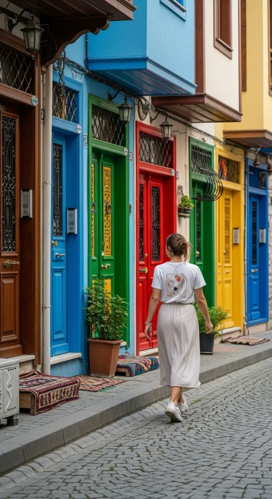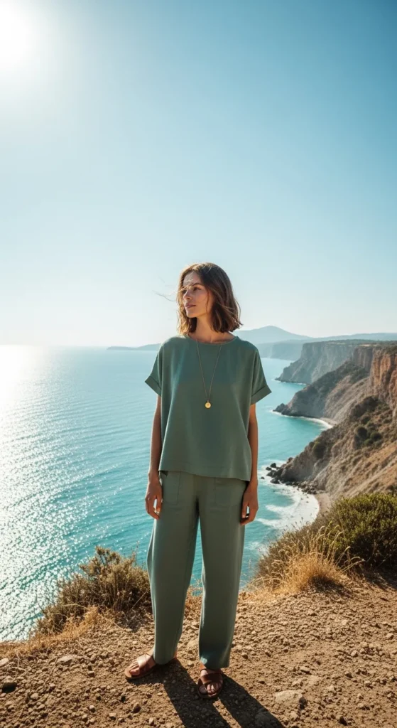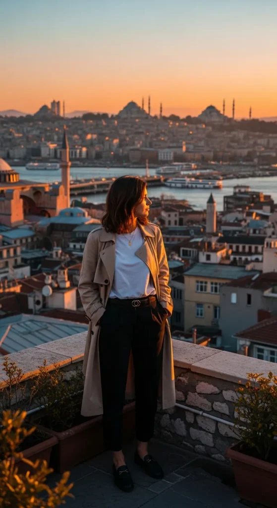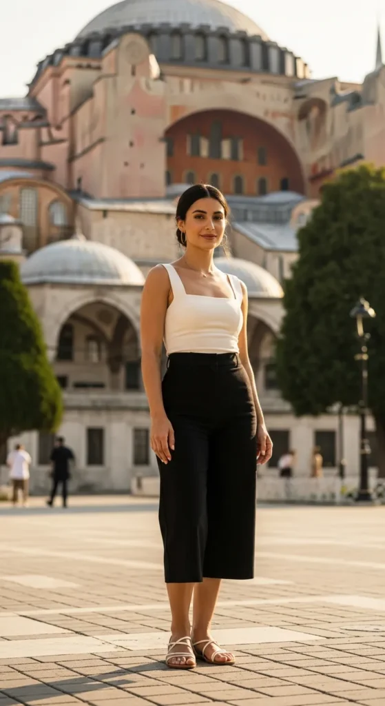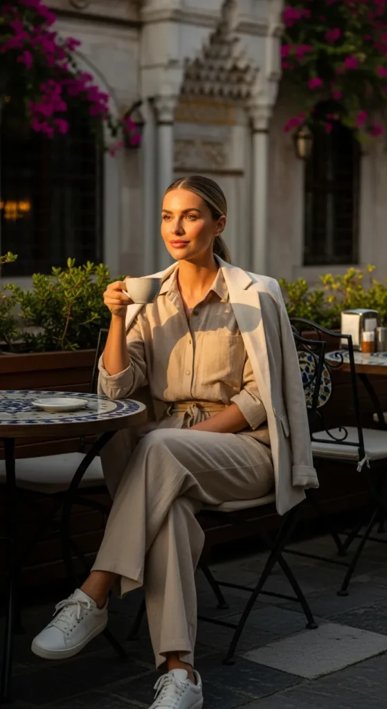 A crisp linen shirt tucked into soft, flowing wide-leg trousers feels effortless while exploring Istanbul’s historic districts. The breathable fabric keeps you cool, and the silhouette looks relaxed yet polished against old stone architecture.