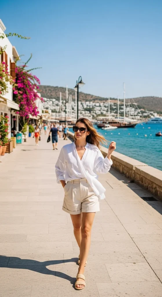 For coastal towns like Bodrum, tailored high-waisted shorts paired with a breezy oversized blouse feel chic but not too revealing. The structure of the shorts balances the softness of the top beautifully.