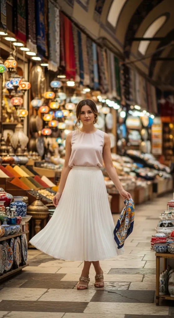 A satin midi skirt paired with a structured tee balances casual and refined. The subtle shine catches the Turkish sun beautifully during late afternoon strolls.