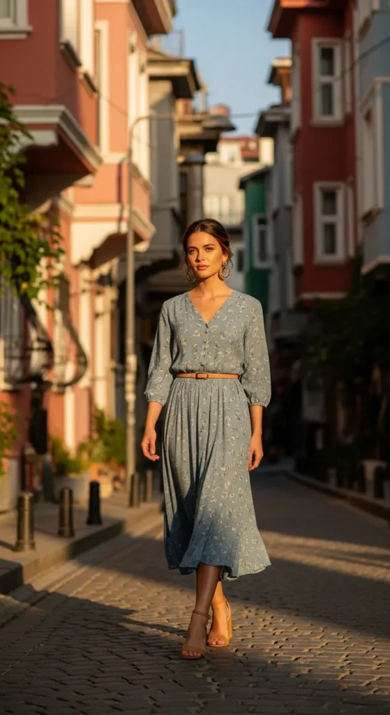 A flowy midi dress with subtle Mediterranean-inspired prints feels romantic without being loud. The belted waist adds shape while keeping things modest and movement-friendly for long sightseeing days.