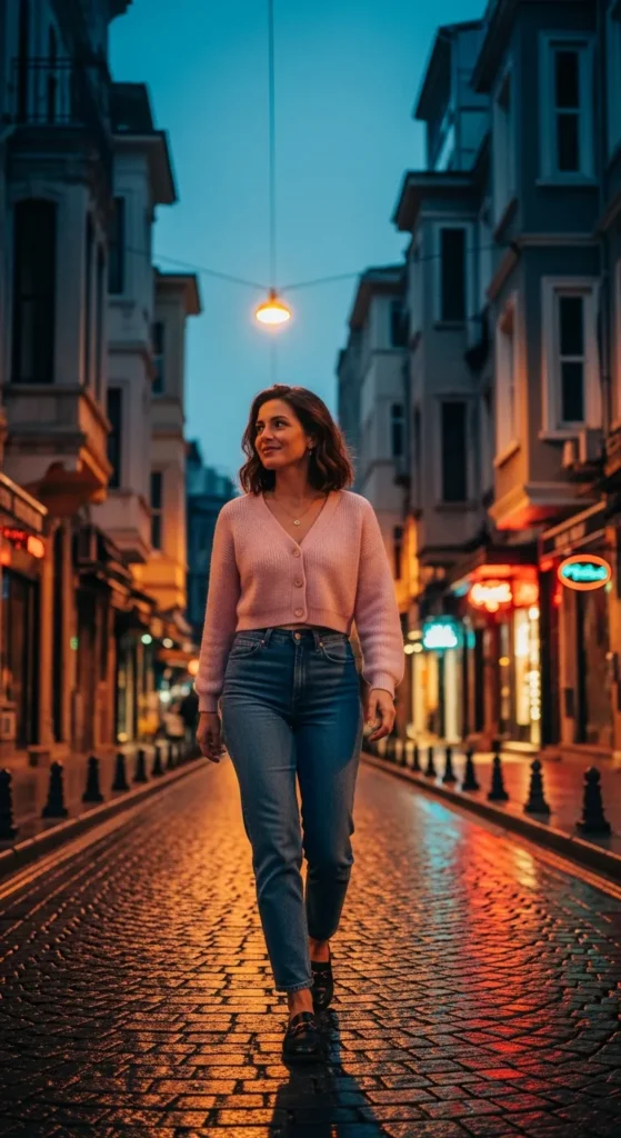 High-rise straight jeans and a cropped cardigan feel cozy yet modern for spring evenings. It’s comfortable enough for long walks and layered enough for cool breezes.